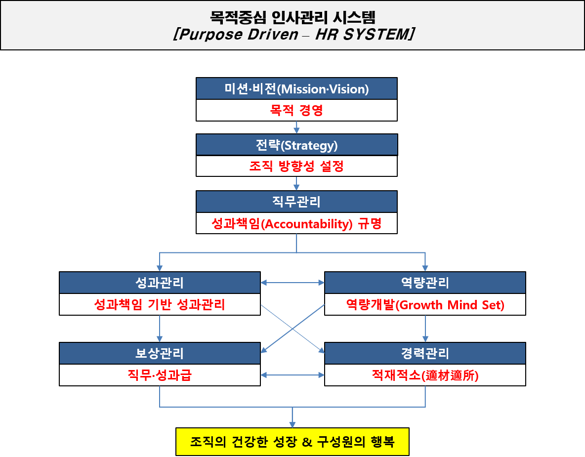 목적중심 인사관리는 미션·비전, 전략, 직무관리, 성과관리, 역량관리, 보상관리, 경력관리로 구성된다. 목적중심 인사관리는 궁극적으로 ‘조직의 건강한 성장과 구성원의 행복’을 지향하며 상기 7개의 핵심 기능이 서로 연계되어 작동하게 된다.