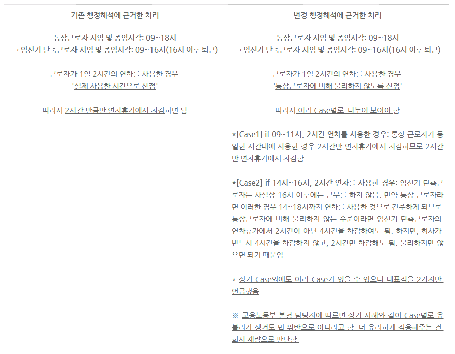 그렇다면 임신기 근로시간 단축기간 중 근로자가 2시간, 3시간 단위로 순수한 시간단위 연차휴가를 사용하는 경우에는 어떻게 하는 것이 바람직할 까요? 네, 그냥 기존 처럼 '사용한 시간만큼 차감'하는 것을 추천드립니다. 너무 복잡해서 그렇습니다. 물론 변경 된 행정해석에 대한 고용노동부 입장이 '불리하지 않으면 되는' 최소요건 존중이니까. 회사입장에서는 Case1의 경우에는 2시간, Case2의 경우에는 4시간 차감할 수도 있겠죠. 하지만 '정서법'이라는게 있으니...신중하게 판단해보셨으면 합니다.